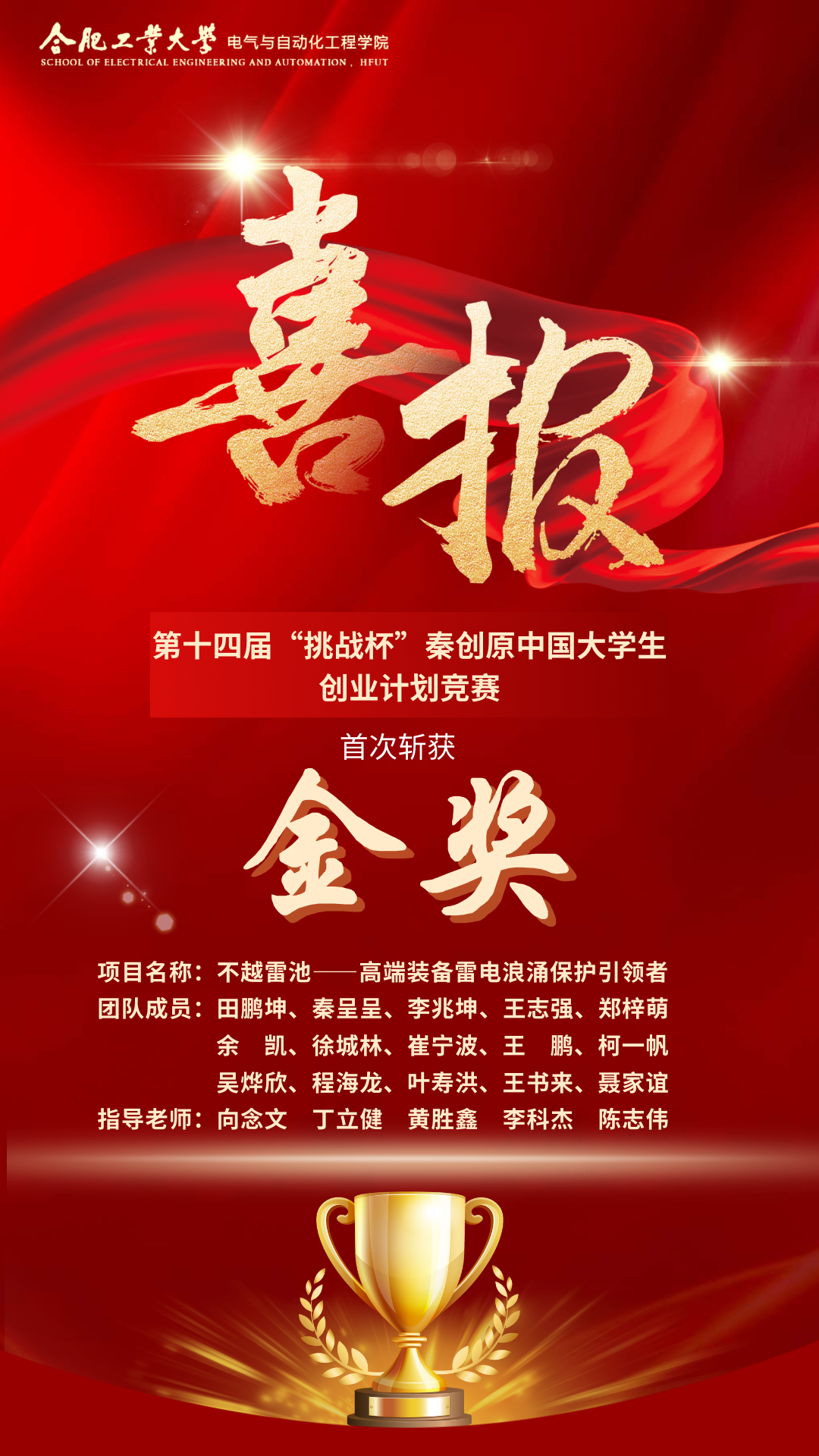 10月29日至11月2日,由共青团中央、教育部、人力资源社会保障部、中国科协、全国学联、陕西省人民政府联合主办的第十四届“挑战杯”秦创原中国大学生创业计划竞赛于西安交通大学举行。经过激烈角逐,我院《不越雷池--高端装备雷电浪涌保护引领者》项目(指导老师:向念文、丁立健、黄胜鑫、李科杰、陈志伟;团队成员:田鹏坤、秦呈呈、李兆坤、王志强、郑梓萌、余凯、徐城林、崔宁波、王鹏、柯一帆、吴烨欣、程海龙、叶寿洪、王书来、聂家谊)斩获全国金奖,这是我院在全国“挑战杯”赛事上的历史性突破。