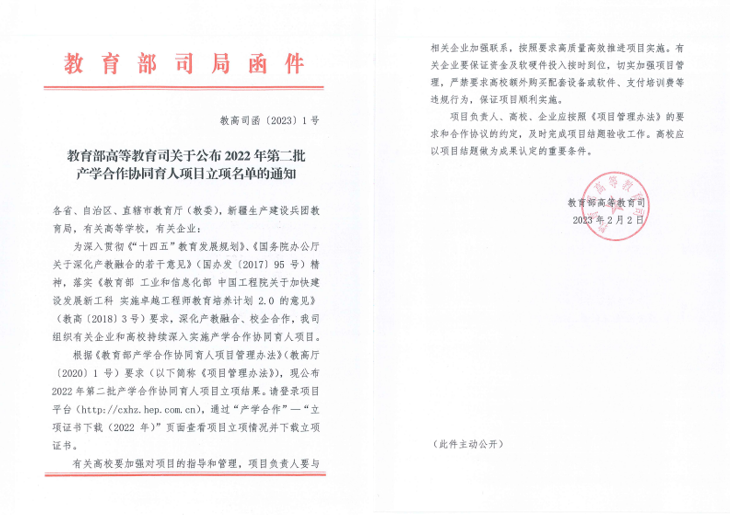 近日,教育部高等教育司发布了《关于公布2022年第二批产学合作协同育人项目立项名单的通知》(教高司函〔2023〕1号),我校获批18项教育部2022年第二批产学合作协同育人项目,2022年度总计获批立项数达26项。