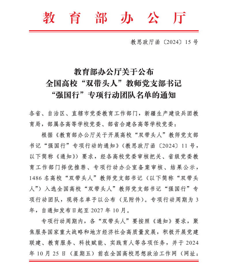 全国高校“双带头人”教师党支部书记“强国行”专项行动旨在创新落实立德树人根本任务,充分发挥“双带头人”的示范引领作用,聚焦服务国家重大战略和地方经济社会高质量发展,积极开展党建联建、教育服务、科技赋能、实践育人等各项任务,在以中国式现代化全面推进强国建设、民族复兴伟业新征程上砥砺新担当、展现新作为。