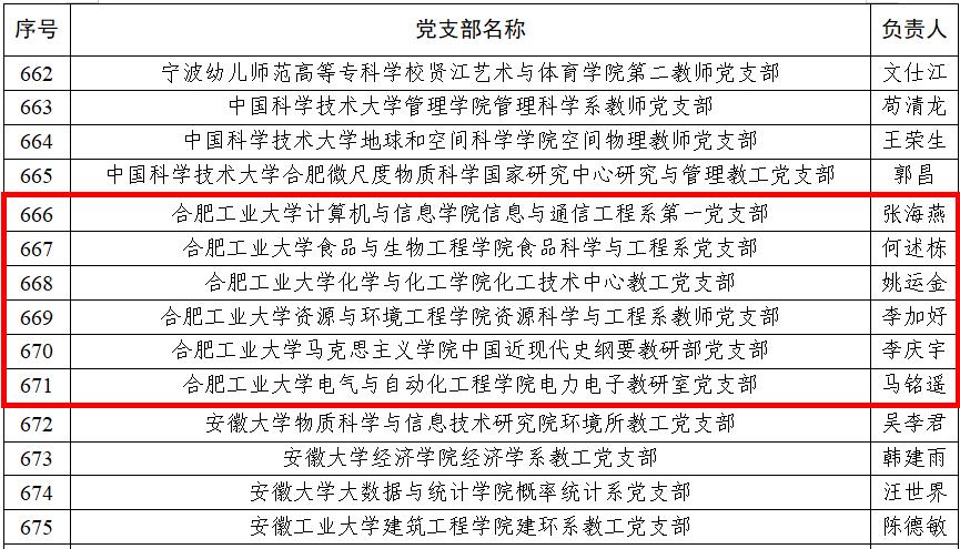 近日,教育部办公厅公布全国高校“双带头人”教师党支部书记“强国行”专项行动团队名单,我校计算机与信息学院信息与通信工程系第一党支部、食品与生物工程学院食品科学与工程系党支部、化学与化工学院化工技术中心教工党支部、资源与环境工程学院资源科学与工程系教师党支部、马克思主义学院中国近现代史纲要教研部党支部、电气与自动化工程学院电力电子教研室党支部等6个党支部成功入选,入选数量位居全国高校前列。