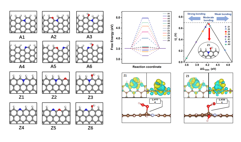 基于第一性原理计算,研究人员揭示了石墨氮和羟基基团作为活性位点在ORR反应中的重要作用,这些基团可以有效调控局部电子浓度,促进氧气吸附以及过氧化氢的脱附过程,当石墨氮和羟基基团共同作用时关键中间体的结合能接近火山峰顶点,是促进二电子氧还原反应的理想构型。