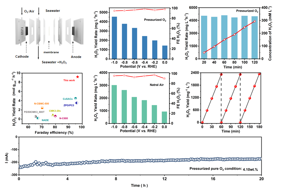 过氧化氢(H₂O₂)作为一种多功能化学品,广泛应用于许多工业领域,尤其在环保、消毒和化学合成中具有重要作用。目前全球年生产能力已超过300万吨,然而超过98%的H₂O₂仍通过能耗高且废物较多的蒽醌氧化法合成。相比之下,电化学方法利用两电子氧还原反应为H₂O₂制备提供了简便、安全、低成本的生产替代方案。该方法仅需氧气、电解液和电能即可高效生成高纯H₂O₂。然而,传统的酸性或碱性介质中H₂O₂的合成常面临复杂的pH调节和分离困难等问题。因此,研究者们近年来开始关注在中性条件下合成H₂O₂的技术,这种方法不仅能够提供稳定的储存介质,且不需复杂的后处理过程,具有巨大的应用潜力。