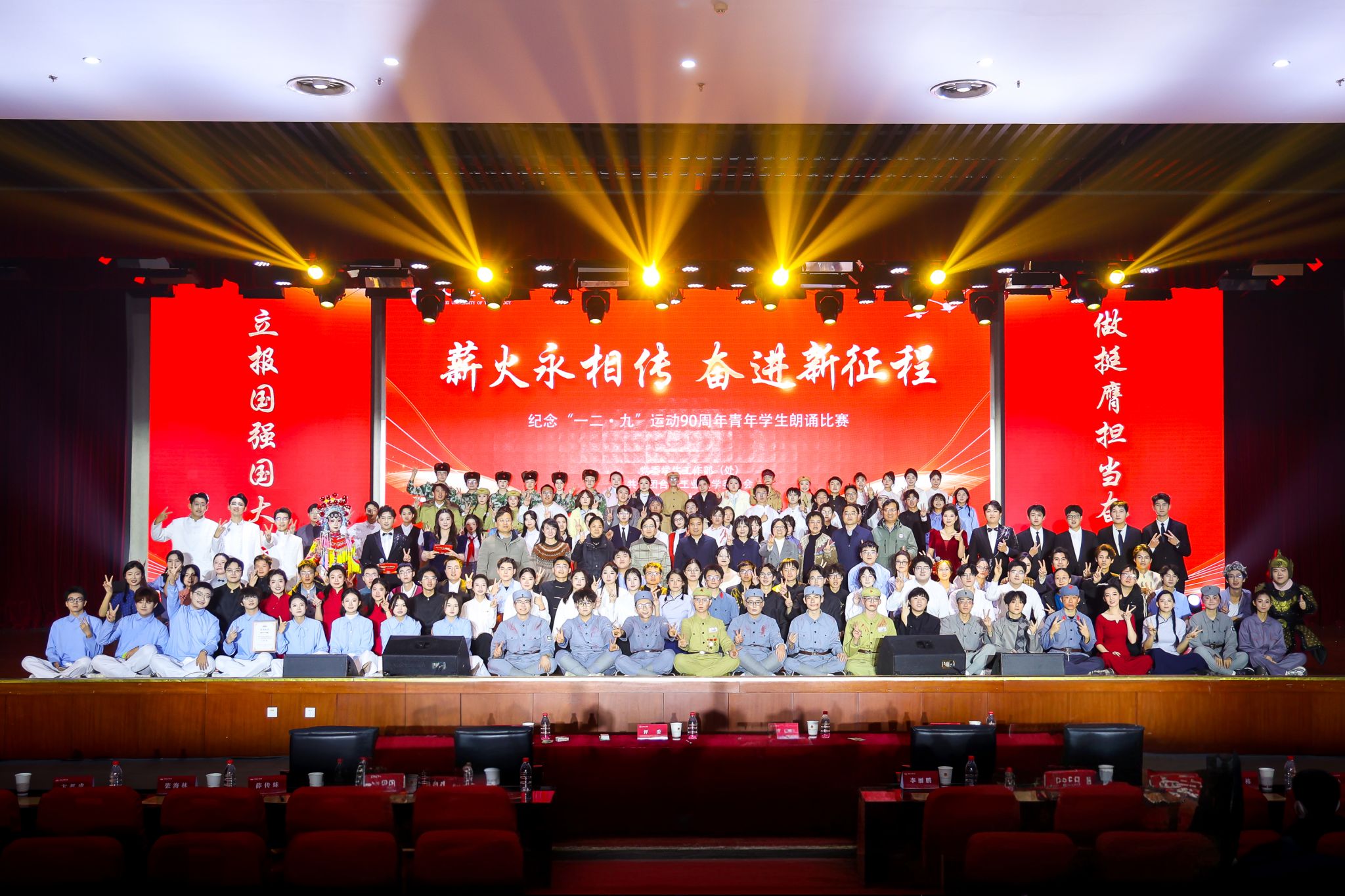 纪念“一二·九”运动90周年青年学生朗诵比赛既是一堂深刻的爱国主义教育实践课,也是一次以美育人、以文化人的美育实践。活动集思想性、教育性、艺术性于一体,旨在激励广大青年学生将爱国之情、强国之志转化为报国之行,在全面建设社会主义现代化国家、以中国式现代化全面推进中华民族伟大复兴的新征程上挺膺担当、贡献青春力量。