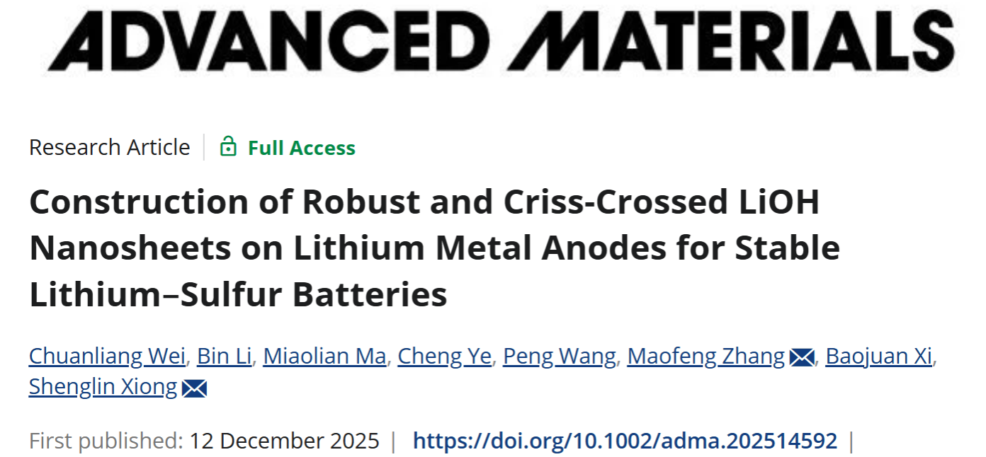 近日,化学与化工学院张茂峰教授团队在锂硫电池化学储能领域取得新进展。相关成果以题“Construction of Robust and Criss-Crossed LiOH Nanosheets on Lithium Metal Anodes for Stable Lithium–Sulfur Batteries”在材料领域国际知名期刊《Advanced Materials》上发表。新进教师魏传亮博士为论文第一作者,张茂峰教授和山东大学熊胜林教授(我校兼职教授)为论文共同通讯作者。星空游戏官网app为论文第一通讯单位。