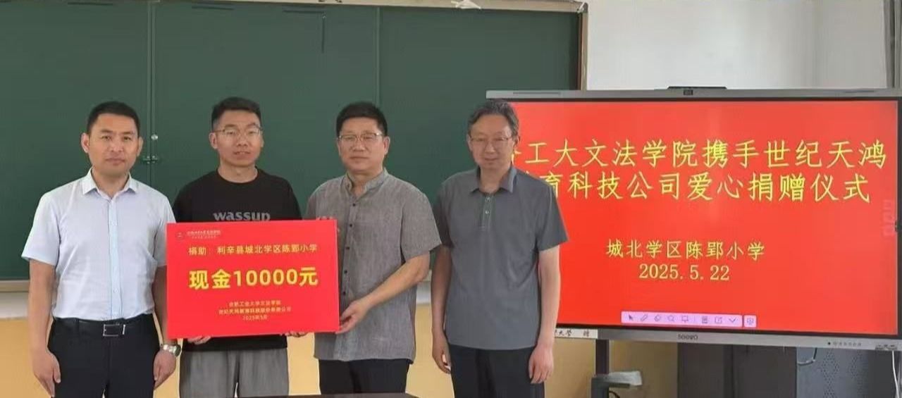 为助力农村教育发展,落实学校关于乡村振兴的相关工作安排,5月22日,文法学院联合校企合作企业世纪天鸿教育科技股份有限公司赴利辛县城北镇开展捐资助学送法下乡活动。学院院长吴椒军、副处级组织员沈鹏、世纪天鸿安徽省区域总经理刘庆堂等参加活动。