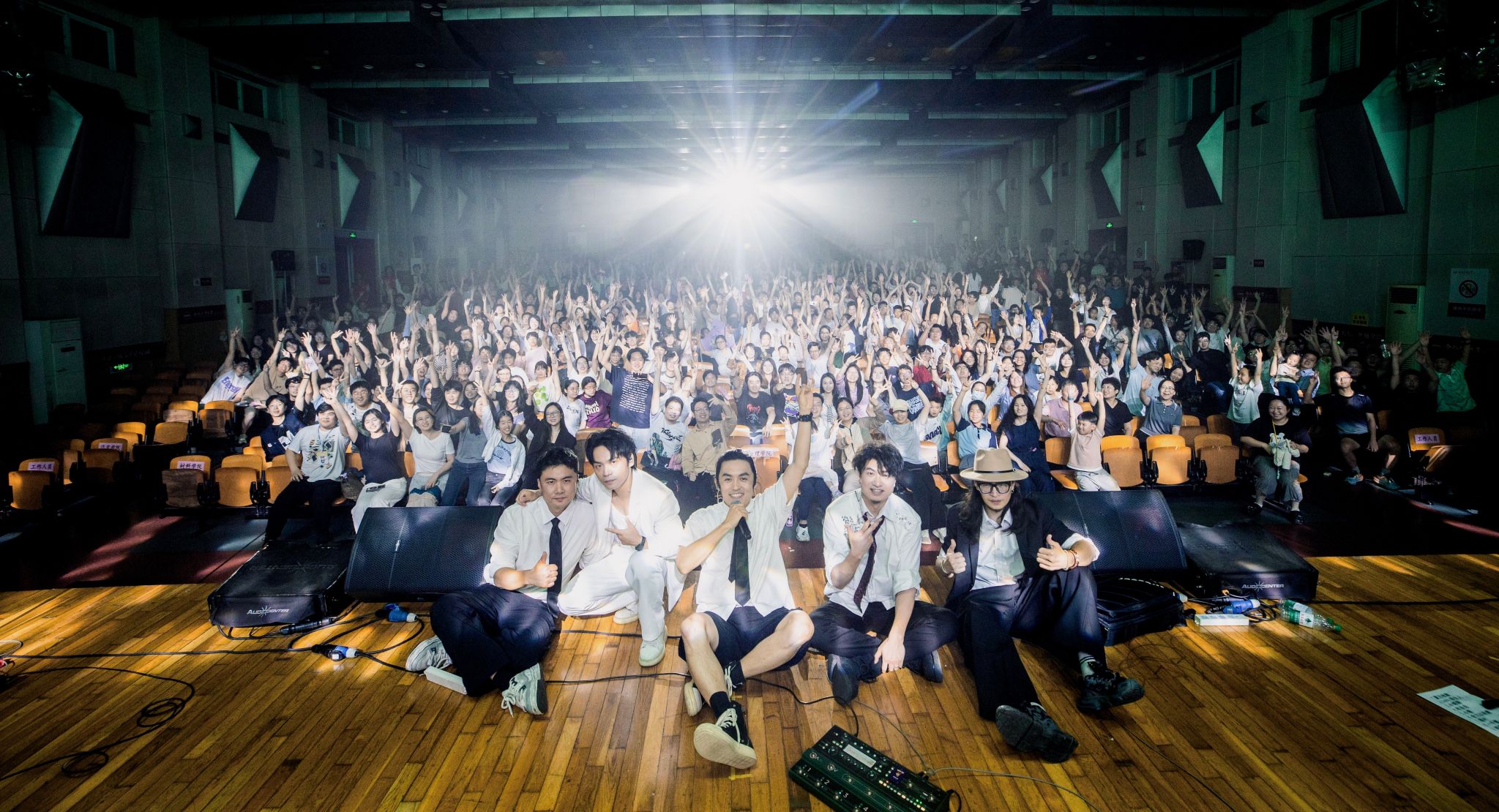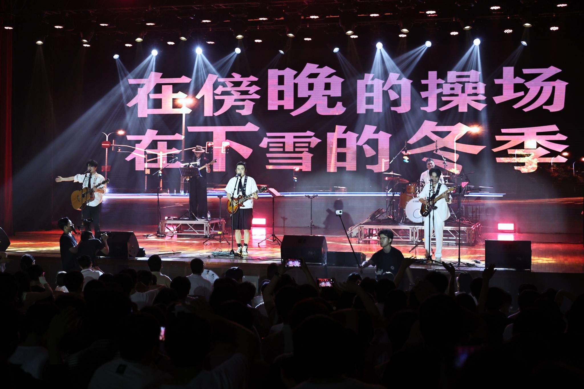 在全场的深情期待中,安子与九妹乐队闪亮登场。为献礼母校80周年华诞,乐队精心创作了原创歌曲《奔赴下一个山海》,并在现场将歌曲版权赠予母校。随后,乐队以《夏日牧歌》开场,《hello陌生人》《小嫦娥》《布谷鸟》等歌曲迅速点燃了现场气氛。《小巷》《全力以赴爱自己》《落叶》和《一千零一夜》,展现出乐队多元的音乐风格与深刻的人生感悟。歌曲《当理想吹动海浪》《新年好》欢快激昂,《晚安合肥》《南海少年》饱含对合肥与合工大的浓厚情怀。现场聚光灯下的齐声合唱将活动推向高潮。乐队成员表示,无论走多远,母校始终是创作的重要基石。