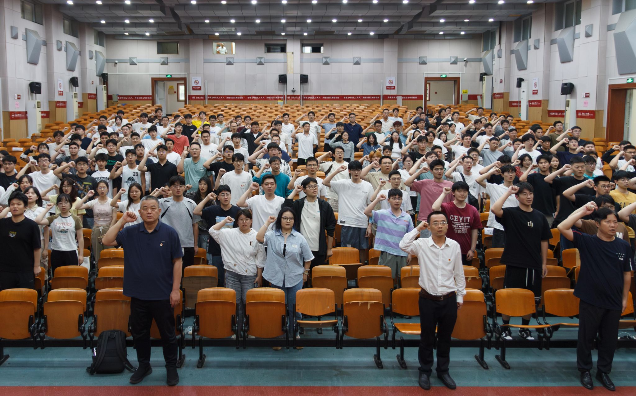 党课尾声,全体毕业生党员面向鲜艳的党旗,庄严高举右拳,重温入党誓词。这铿锵有力的誓言在礼堂内回荡,是一次深刻的党性教育与灵魂洗礼。