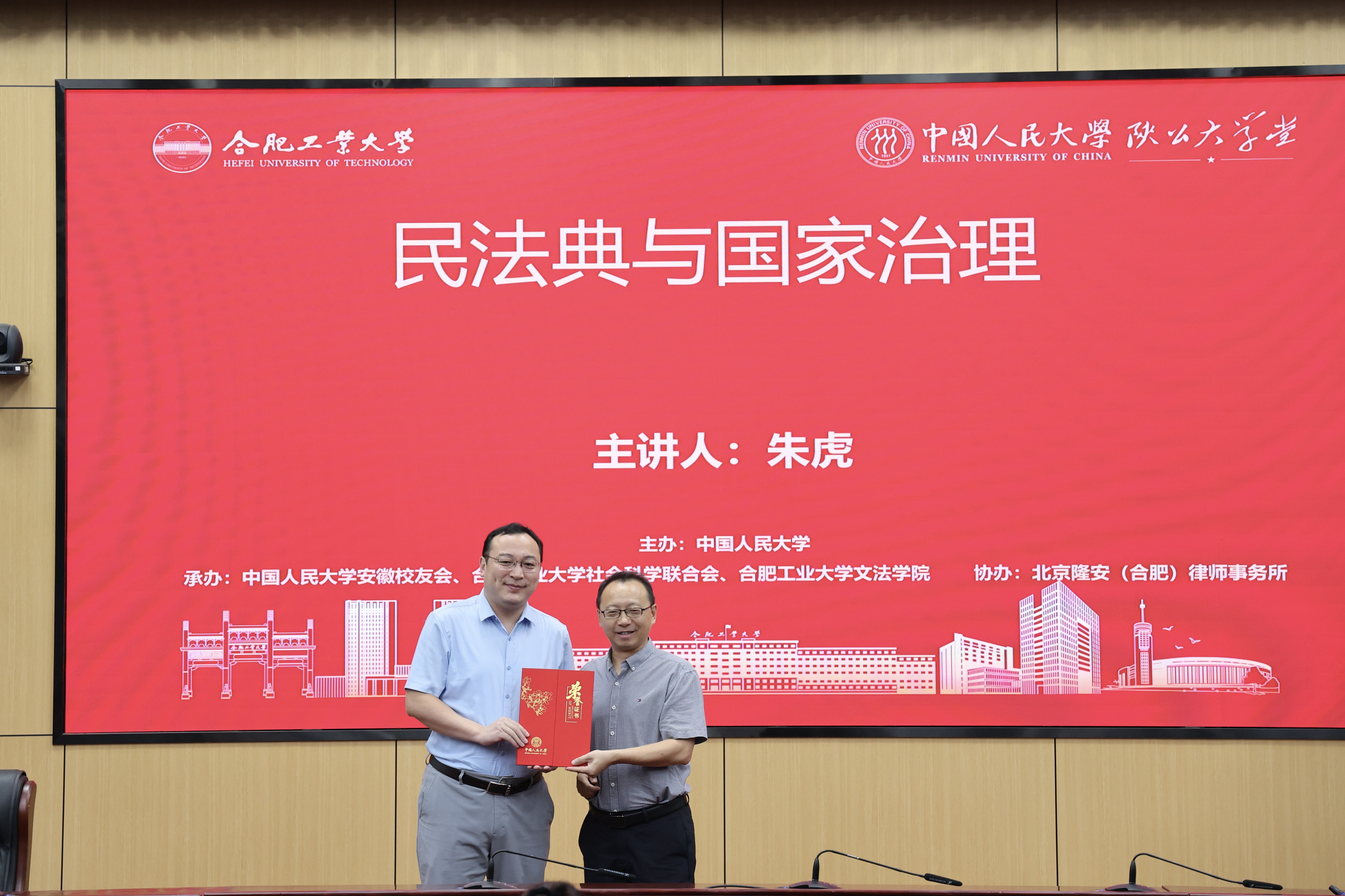 9月27日上午,由中国人民大学主办,中国人民大学安徽校友会、星空游戏官网app社会科学联合会、星空游戏官网app文法学院承办,北京隆安(合肥)律师事务所协办的中国人民大学“陕公大学堂”系列公益讲座在我校举行。中国人民大学法学院副院长朱虎教授应邀作题为“民法典与国家治理”专题报告。学校党委常委、副校长吴华清出席讲座,文法学院副院长霍敬裕主持活动。