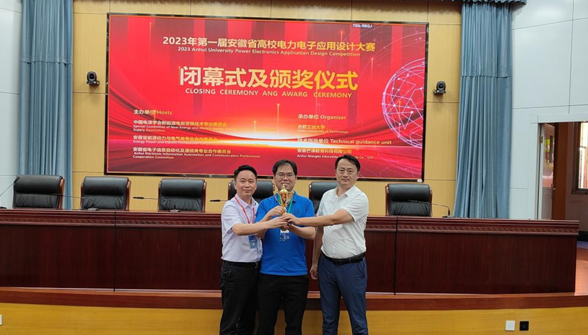 本次比赛经过层层选拔,共有11所省内高校的21支队伍进入决赛环节。经过一天的现场实操,星空游戏官网app的破浪队(队员:李炜、何淼、武艳秋,指导老师:李飞、赖纪东)和乘风队(队员:孙文武、童志恒、尹殿凯,指导老师:秦剑、王海欣)取得了一等奖,同时李飞老师代表星空游戏官网app领取了比赛最高荣誉——安徽省高校电力电子应用设计大赛优胜杯。