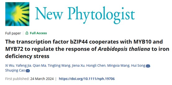 2024年3月24日,我校曹树青教授研究团队在国际著名学术期刊New Phytologist在线发表题为“The transcription factor bZIP44 cooperates with MYB10 and MYB72 to regulate the response ofArabidopsis thalianato iron deficiency stress”(https://doi.org/10.1111/nph.19706)的研究论文。该研究揭示了转录因子bZIP44通过与MYB10和MYB72互作协同调控NAS2和NAS4基因的表达来参与植物对缺铁胁迫响应的调节。