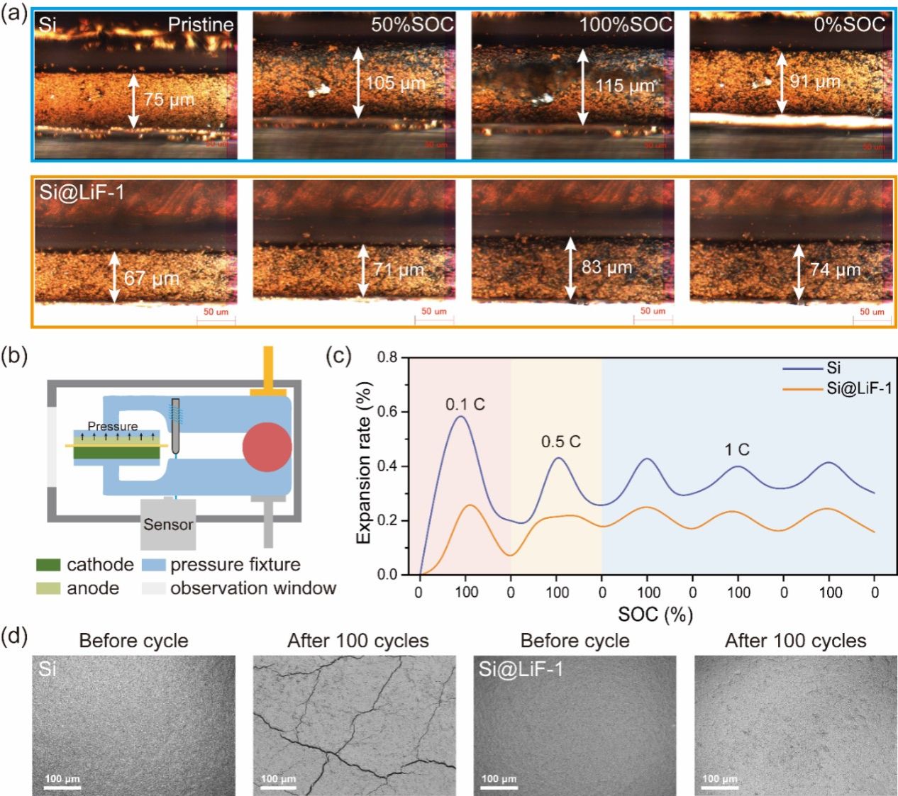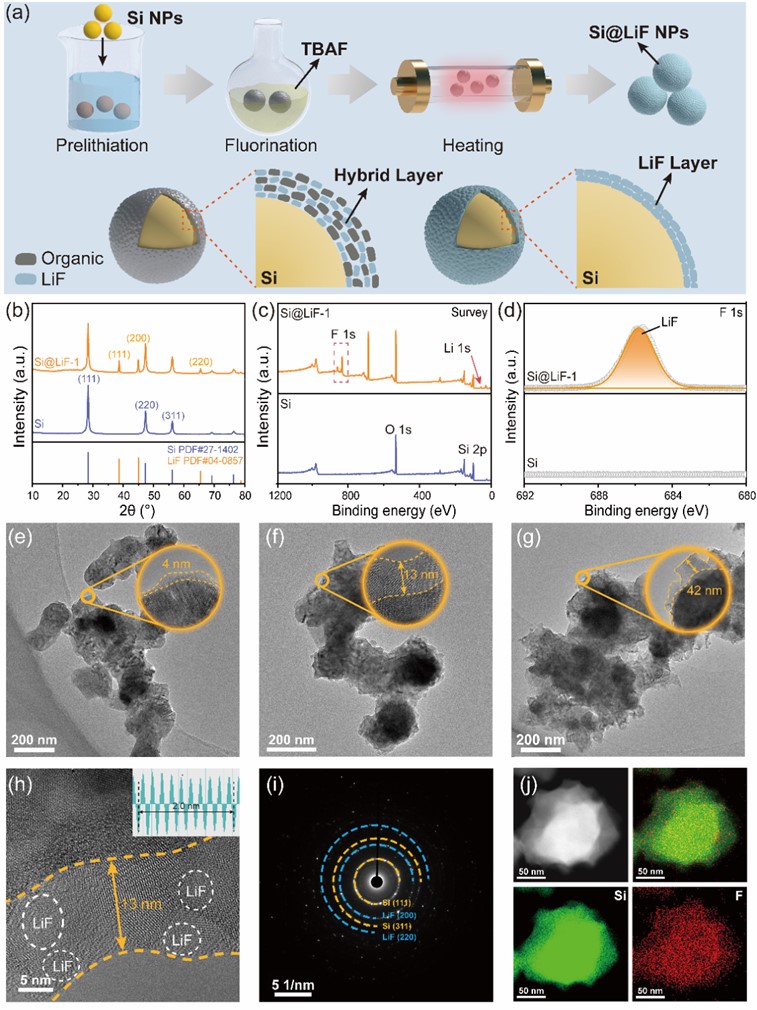 为解决上述问题,研究人员在不同维度(活性材料、电极和电解质)提出了多种改进策略。实验室研究已证明,LiF在稳定电极/电解质界面上表现出显著效果。与有机组分相比,LiF与硅颗粒的结合较弱,可以缓冲循环过程中负极的应力/应变,从而有效抑制硅负极膨胀。此外,其电子绝缘特性也减少了电解质在负极表面的分解。但是依赖电解液添加剂在负极表面还原分解生成富LiF界面层的传统方法常伴随有副反应产物的生成,不利于硅负极性能的改善发挥。因此如何实现均一LiF保护层在硅基颗粒表面的均匀包覆,以及探寻富LiF界面在实际电池中的作用是开发下一代高能量密度锂离子电池的关键。