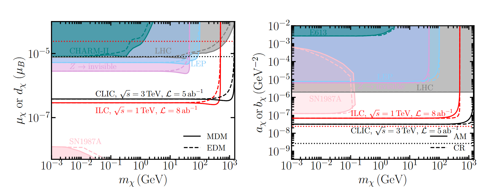 图3.对于不同质量的暗态粒子,ILC和CLIC在95%置信度下给出的关于电磁形状因子的限制