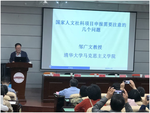 清华大学邹广文教授对国家社科基金申报中需要注意的几个问题做出了具体的指导。他在报告中指出,首先,申请书的形式很重要,应规范填写申请书,使其看起来有层次感,拒绝低端错误的出现。其次,选题视角要新颖,应与课题指南相联系,围绕国家发展主要问题展开;第三,文献研究综述需体现前沿意识,内容详细全面,力求创新,突出重点;第四,课题研究意义应单独表述,字斟句酌;第五,研究方法最好以图表形式呈现,直观形象;最后,他鼓励大家发扬敢于尝试、屡败屡胜、精益求精的精神。
