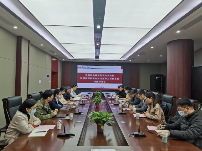 为贯彻落实教育部哲学社会科学知识体系建构和高校咨政服务能力提升工程推进会会议精神,对我校哲学社会科学发展和党的二十大精神研究阐释工作进行部署,科研院社科处于10月12日在学术会议中心召开专题会议传达教育部会议精神。科研院副院长梁昌勇出席会议并讲话,社科相关学院科研副院长、学术骨干及科研秘书参加会议。会议由社科处处长时省主持。