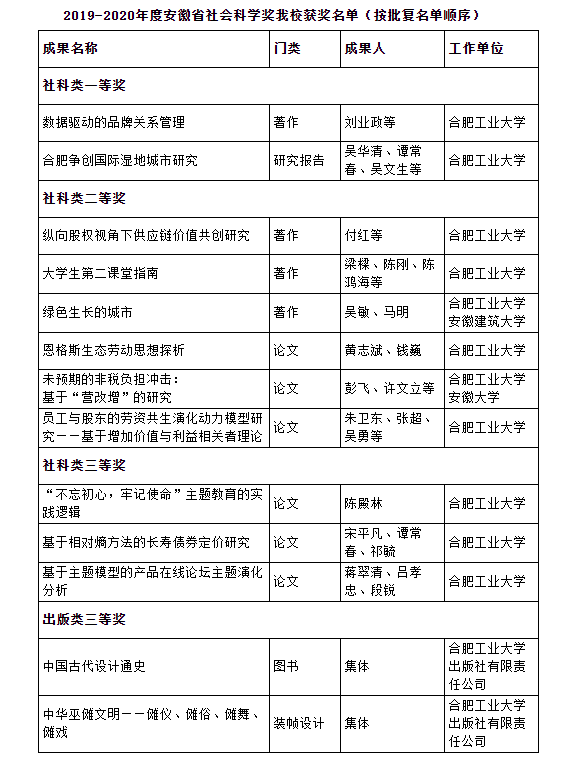 近日,安徽省人民政府正式批复安徽省社会科学奖奖励工作领导小组办公室,同意授予2019—2020年度安徽省社会科学奖一等奖29项、二等奖89项、三等奖182项。