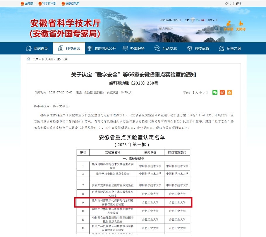 日前,安徽省科技厅发布了《关于认定“数字安全”等66家安徽省重点实验室的通知》(皖科基地秘〔2023〕238号),对40家高校院所类、26家企业类安徽省重点实验室予以最终认定。建艺学院陈刚教授主持申报的“徽州古村落数字化保护与传承创意安徽省重点实验室”成功获批立项建设,这也是建艺学院首次获批安徽省重点实验室。